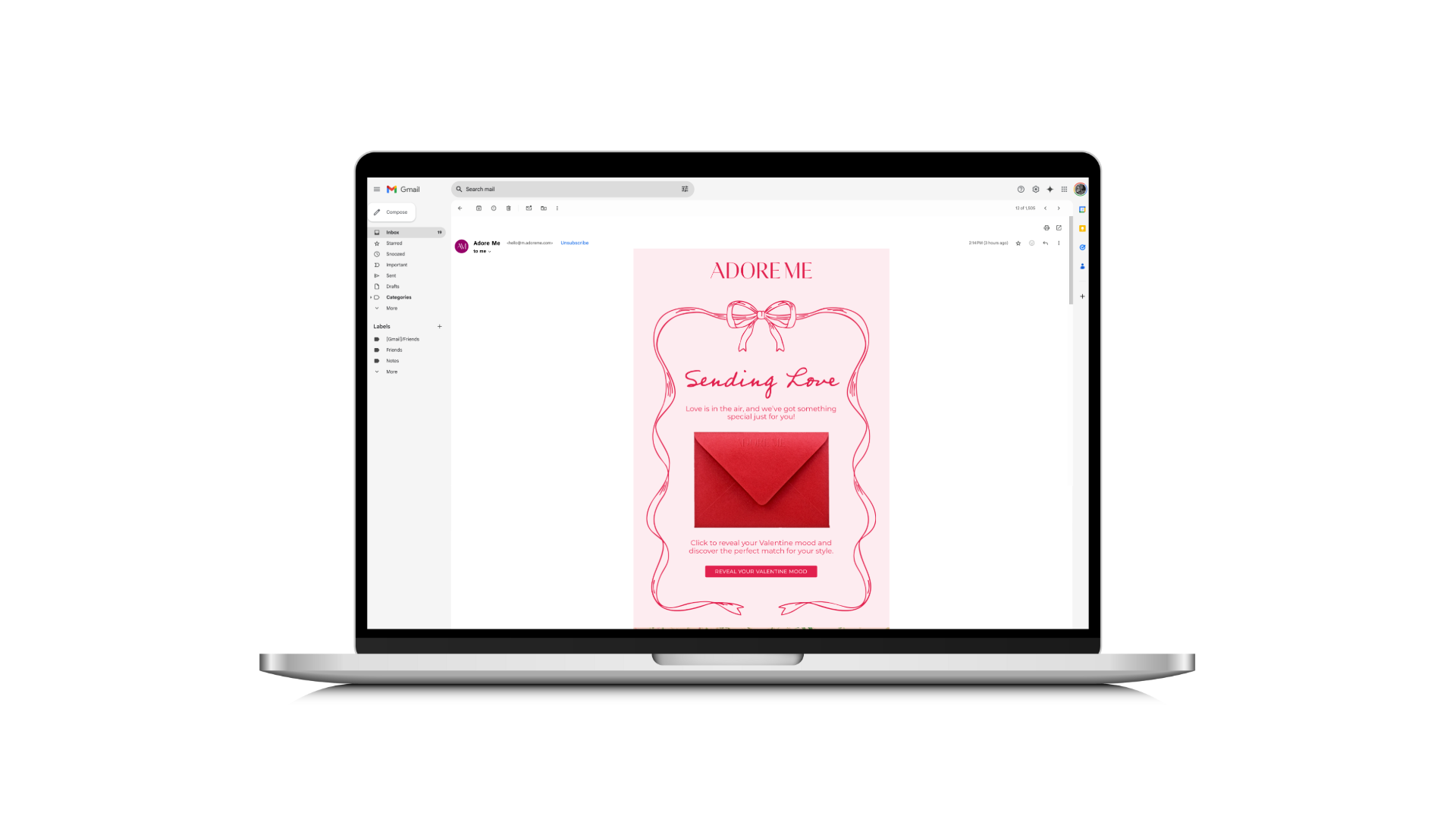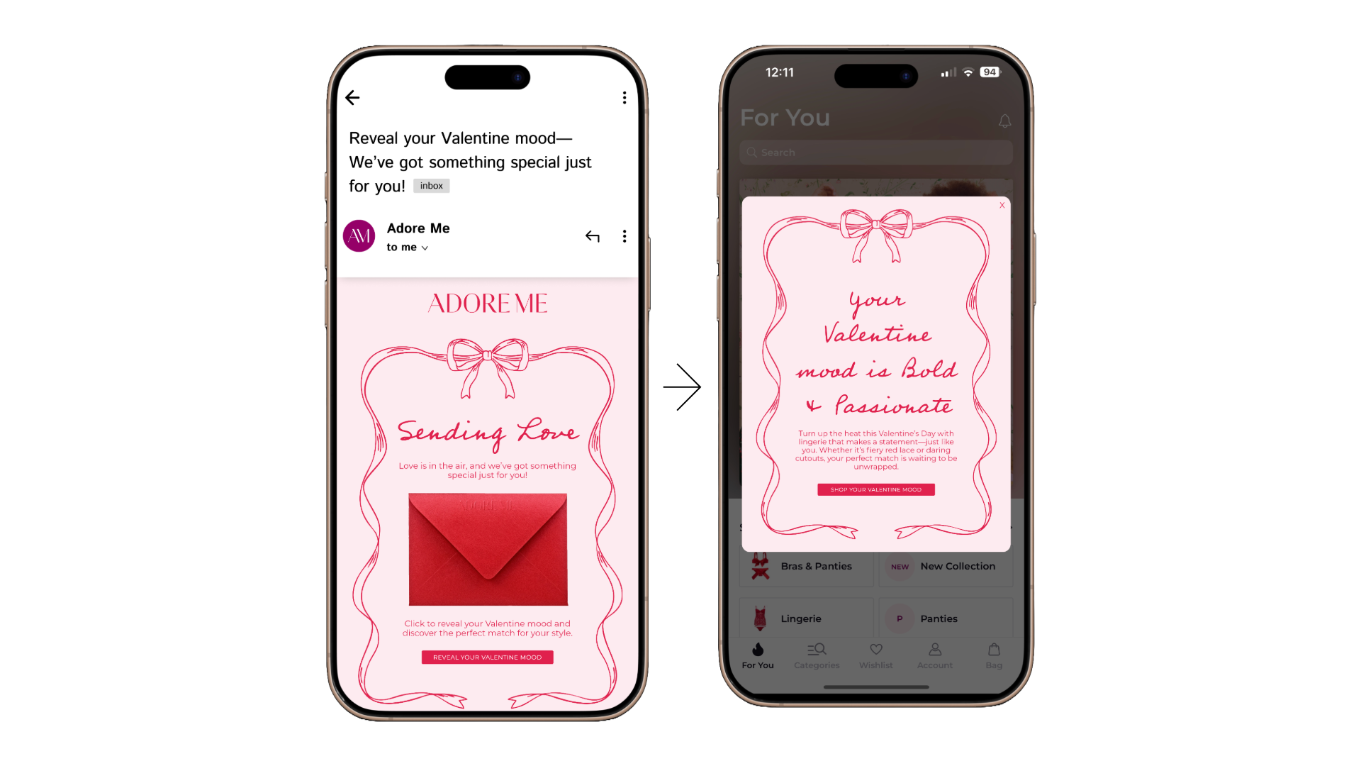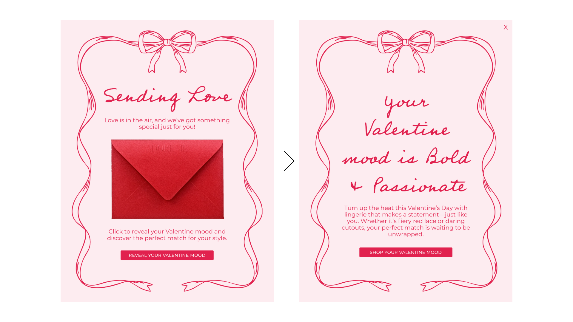 The "Click to Reveal Your Valentine Mood" concept is an engaging, interactive way to captivate customers while driving product discovery and conversions. By introducing an element of surprise, the reveal takes place as a pop-up on the Adore Me app and site, immediately grabbing attention and prompting users to shop. This approach taps into users’ curiosity, encouraging clicks, deeper engagement with the brand, and seamless product exploration.